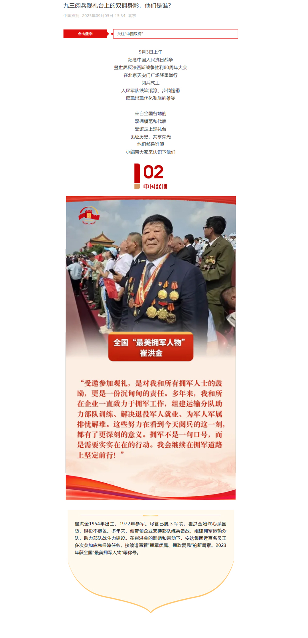 > 崔洪金参加9.3阅兵荣登《中国双拥》杂志